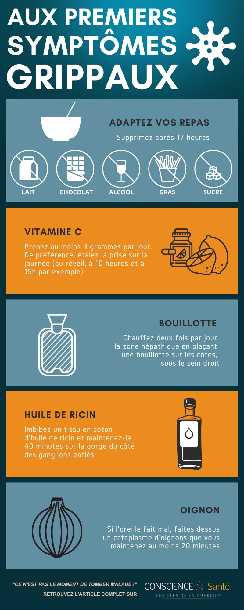 En cette période difficile, il vaudrait mieux éviter de mettre le pied à l’hôpital. C’est sans doute une évidence, mais le meilleur moyen de rester en bonne santé est justement de ne pas tomber malade, et particulièrement d'éviter tout état grippal car cela peut vite dégénérer. Des signes vous permettent d'enrayer son évolution bien avant les premiers symptômes. Il existe également d’autres repères fiables et utiles qui vous aideront, quelques soit la pathologie dont vous souffrez, à ne pas sombrer plus bas. Aujourd’hui, plus que dans n’importe quelle autre période, c’est une question de survie.